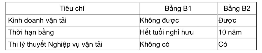 2 loại bằng này về cơ bản cũng gần tương tự như nhau. Loại B1 thì chương trình nhẹ hơn một chút, không phải học & thi phần kinh doanh vận tải. Lệ phí cũng thấp hơn loại B2.
